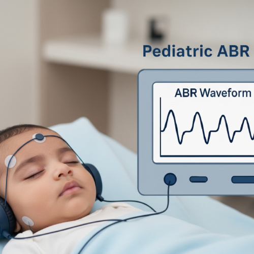 The Auditory Brainstem Response (ABR) test is a non-invasive tool used at Denoc Hearing to assess hearing sensitivity and neural integrity, particularly in infants and young children.
