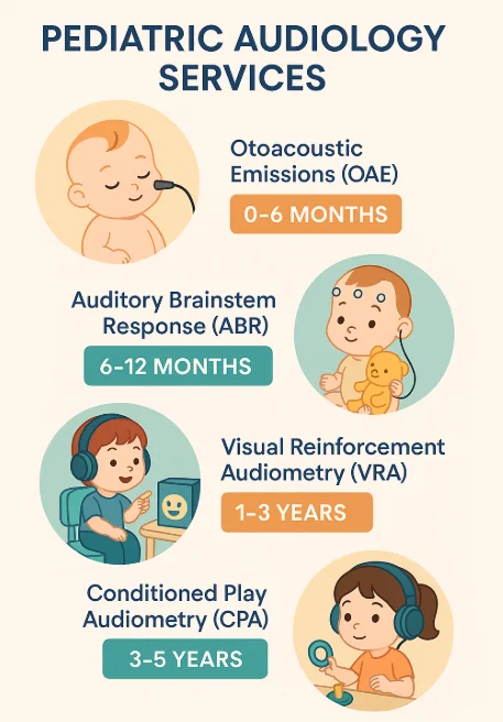 - Visual Reinforcement Audiometry (VRA): Conditions toddlers to turn toward sounds paired with visual rewards (6 months to 2.5 years).